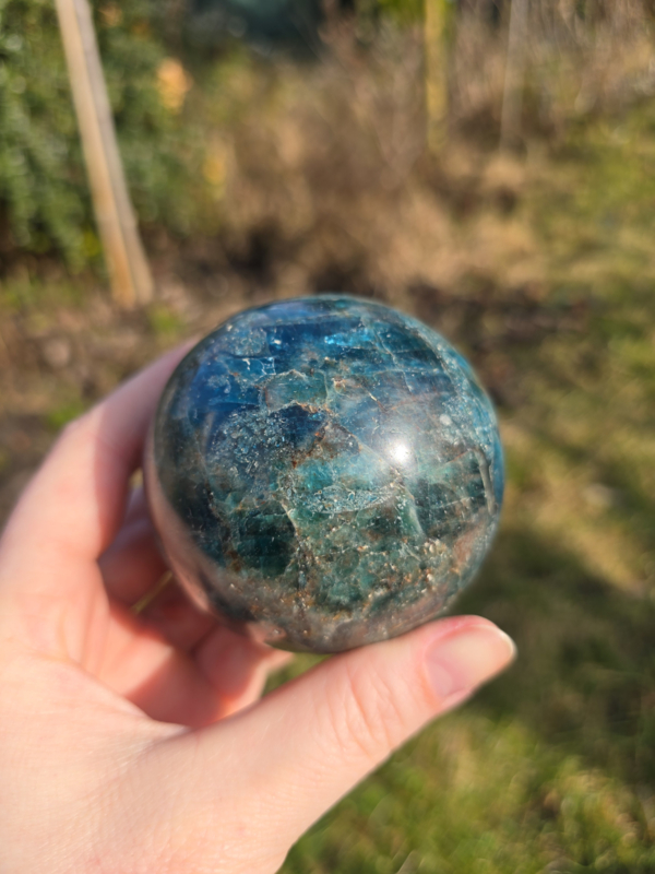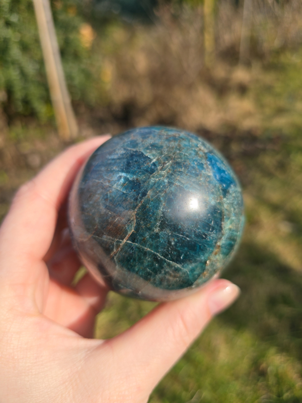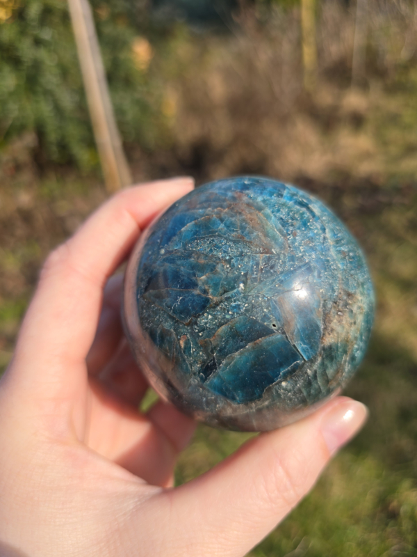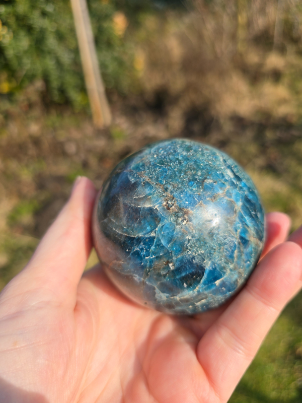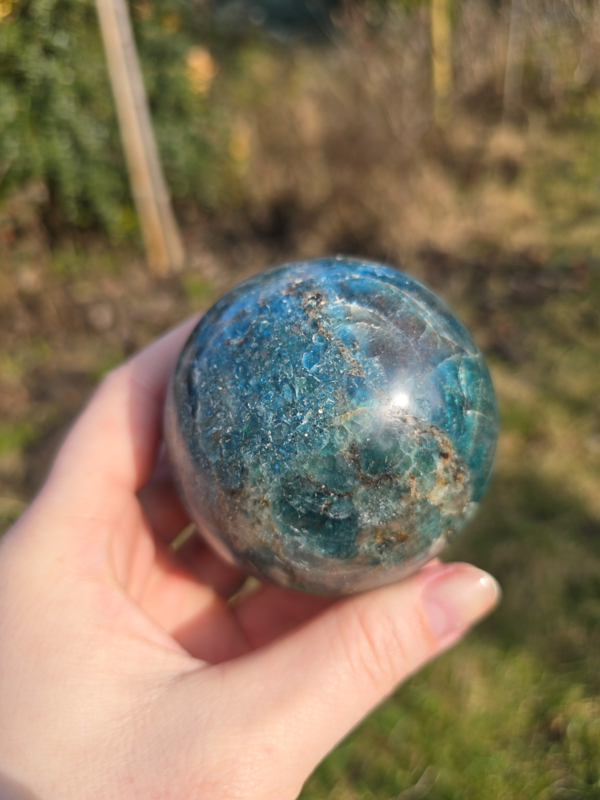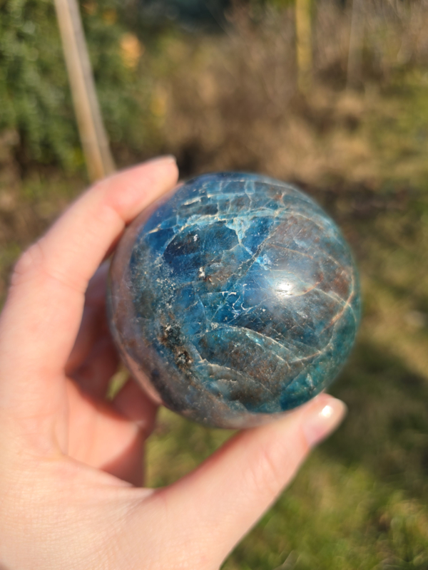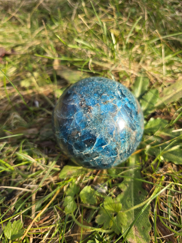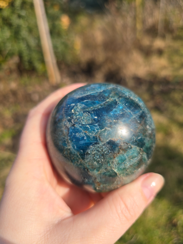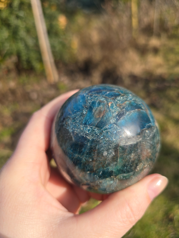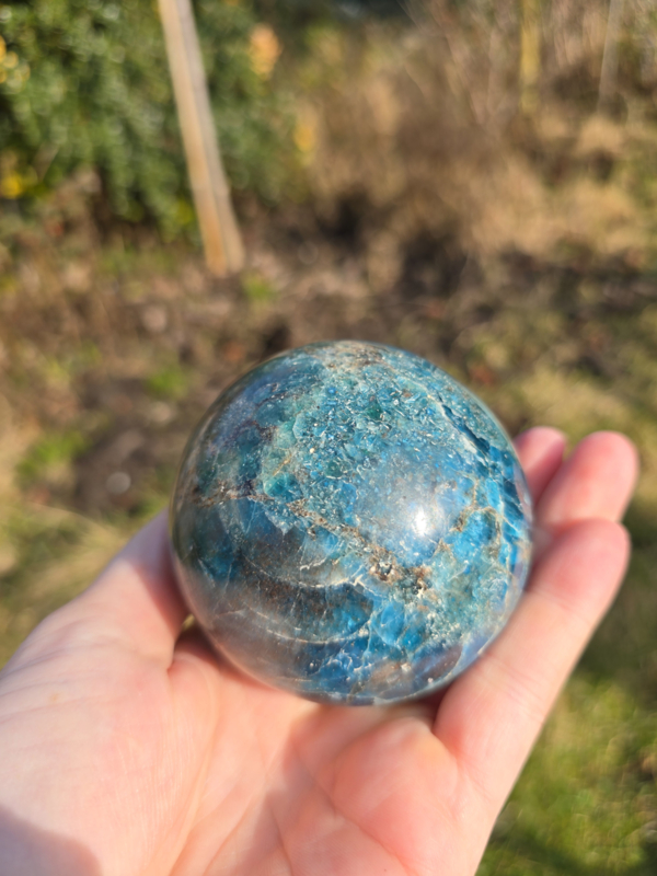 Dee bol is een prachtige blauwe kleur met een klein beetje groen aan 1 kant. Ook zitten er op sommige stukjes als je goed kijkt de bijzonder mooie blauwe flash die je gewend bent van apatiet.