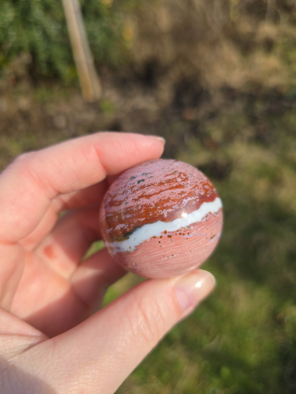 Deze kleur zie je niet vaak zeker niet de combinatie rood en roze (rood is een zeldzame kleur in de oceaan jaspois) . Echt een cutie !