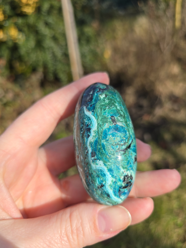 Dit stuk ligt fijn in de hand door zijn lichte gewicht. Het zou mij niet verbazen als er ook wat malachiet in dit stuk zit. Ook is ze mooi gepolijst maar het wat natuurlijke pockets.