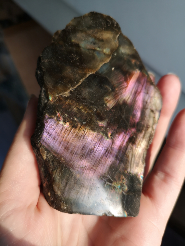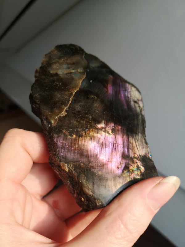 Deze steen heeft een prachtige paarse flash met een bijzonder patroon.