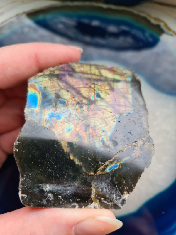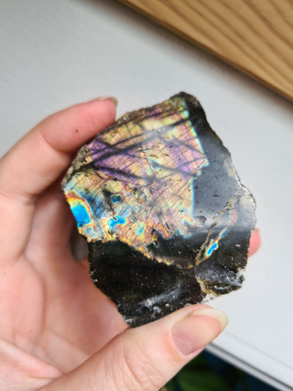 Labradoriet is een sterk beschermende en spirituele steen. Hij beschermt je tegen negatieve invloeden van buitenaf (mens of omgeving) De steen vermindert angst en geeft zelfvertrouwen en kracht. Het versterkt de intuïtie. Hij kan je ook helpen om creatief te denken. Labradoriet komt in bijna alle kleuren van de regenboog voor en is als je het mij vraagt een echte eyecatcher met haar mooie flash en kleurenspel.