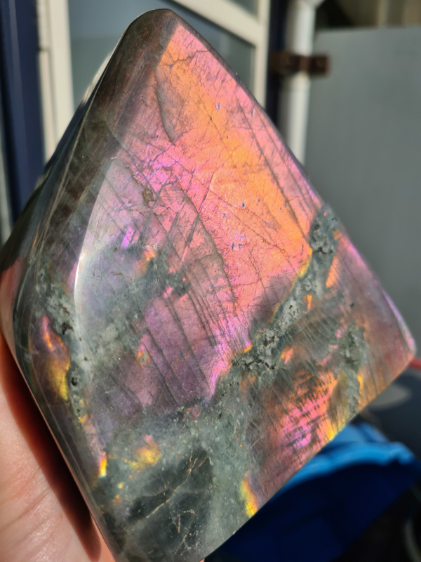 Deze steen heeft een prachtige en super mooie paars/roze/oranje flash, ze is zeker een eye cather met haar mooie kleuren combinatie.